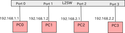 図1の様にL2スイッチの下に4台のPCをぶら下げます。各々固定でIPを振り、PC0は192.168.1.1,PC1は192.168.1.2,PC2は192.168.2.1,PC3は192.168.2.2とします。